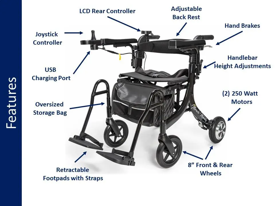 The Miracle Mobility 4N1 allows the user to travel up to 10 miles on a single charge with a 24V 10ah battery. The lithium-ion battery meets all FAA requirements for use in passenger aircraft. The battery must be taken out of the wheelchair and transported in your carry-on luggage when you travel. When the battery is inserted, the 4N1 Ultra Light Multifunctional Electric Walker Wheelchair weighs only 41 lbs. (38 lbs. with the battery removed).