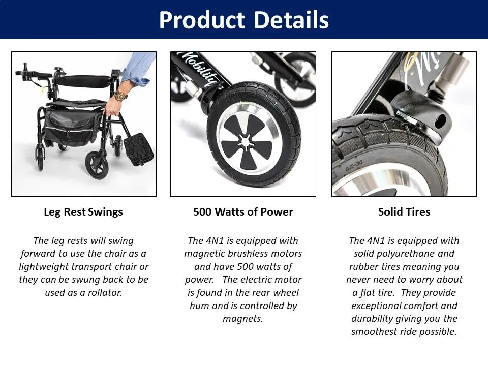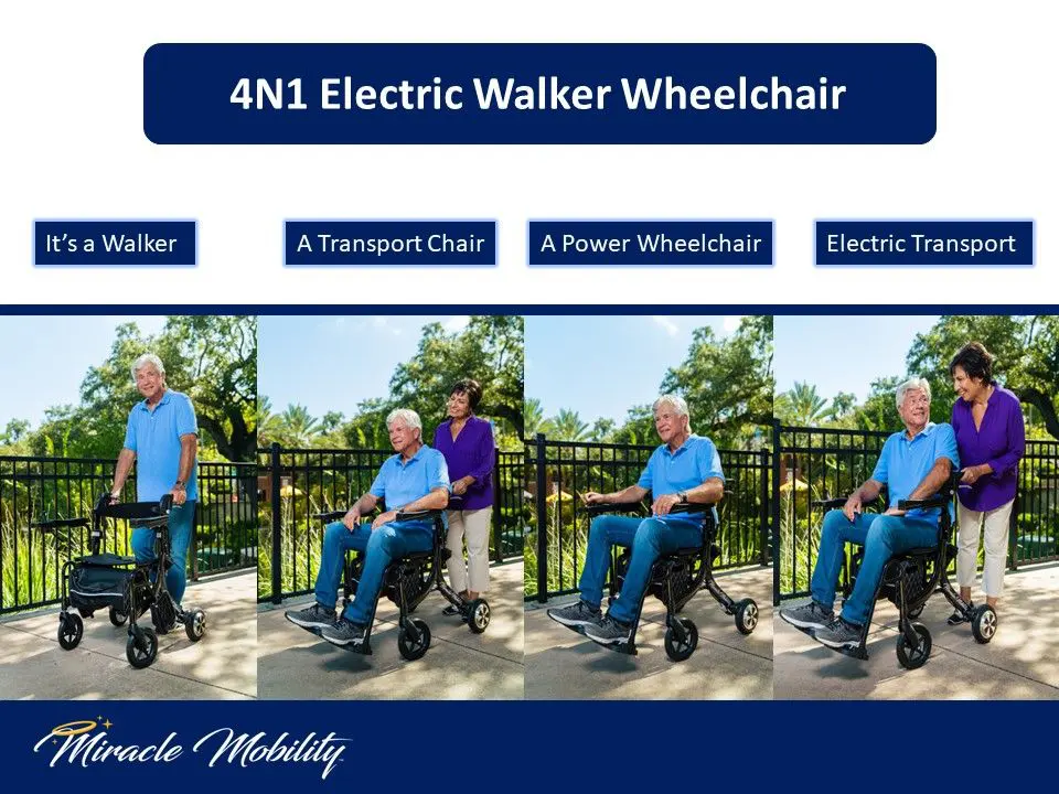 The 4N1 Multifunctional Electric Wheelchair is designed to be a lightweight, multifunctional electric device that allows you to use it as either a Rollator, Manual Wheelchair, Electric Scooter/Wheelchair, or a Power Assist Walker.