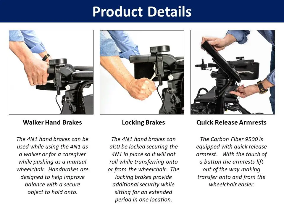 The hand grips on the 4N1 can also be adjusted to five pre-set height adjustments to allow for ergonomic positioning, making it possible to push or use as a walker. The hand grips and armrests have thicker padding and added foam to offer support and a more comfort for your hands and arms. The 4N1's hand brakes can be employed while it's being pushed as a manual wheelchair or used as a walker. To prevent rolling while getting in or out of the wheelchair, the 4N1 hand brakes can be locked in place. The armrests also raise, making it easy to transition onto the 4N1 Electric Walker Wheelchair using the side entry.