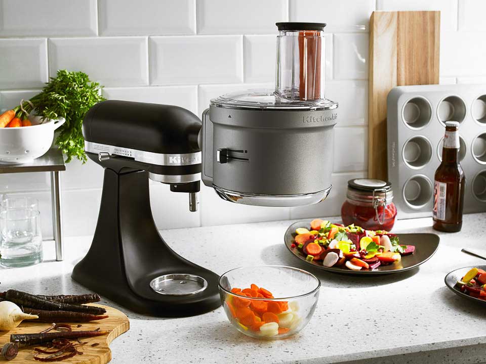 Connect the food processor to the versatile attachment hub on your KitchenAid stand mixer. Simply open the hub cover, attach, and you’re good to go.
