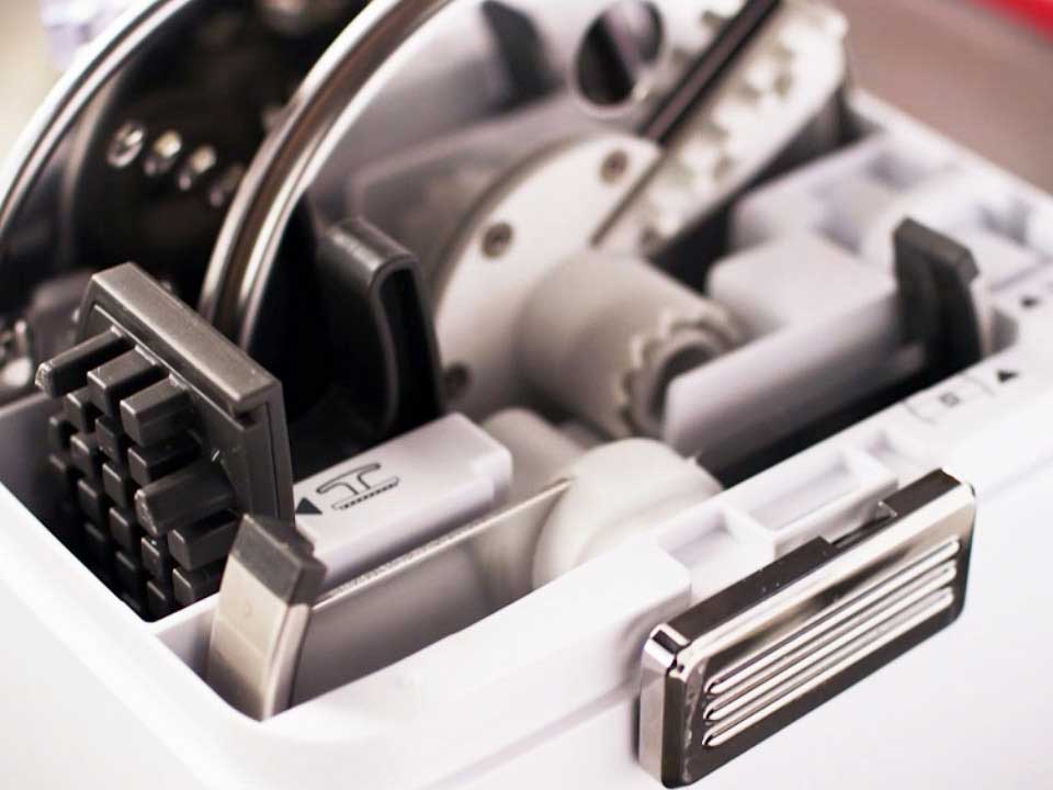 You can change the desired thickness by using the external lever and achieve perfectly even slices. The food wiper, that is fixed under the disc, pushes food towards the opening whilst slicing. Dishwasher safe on top rack.